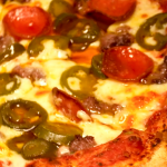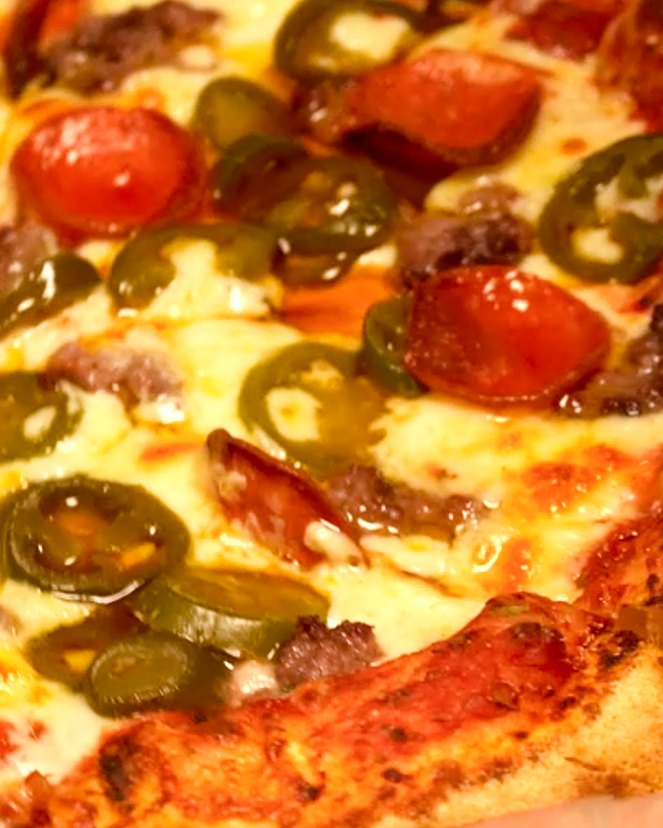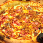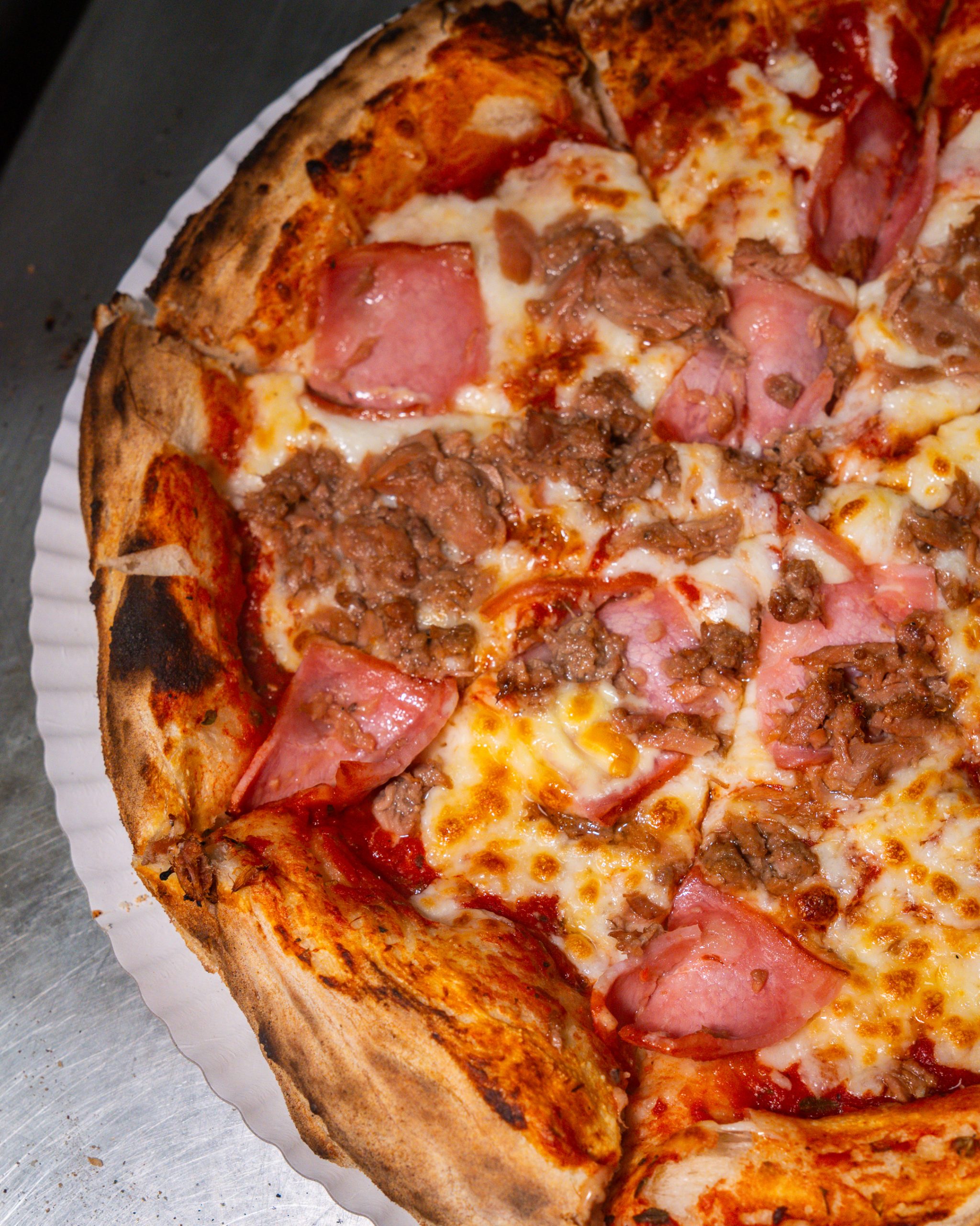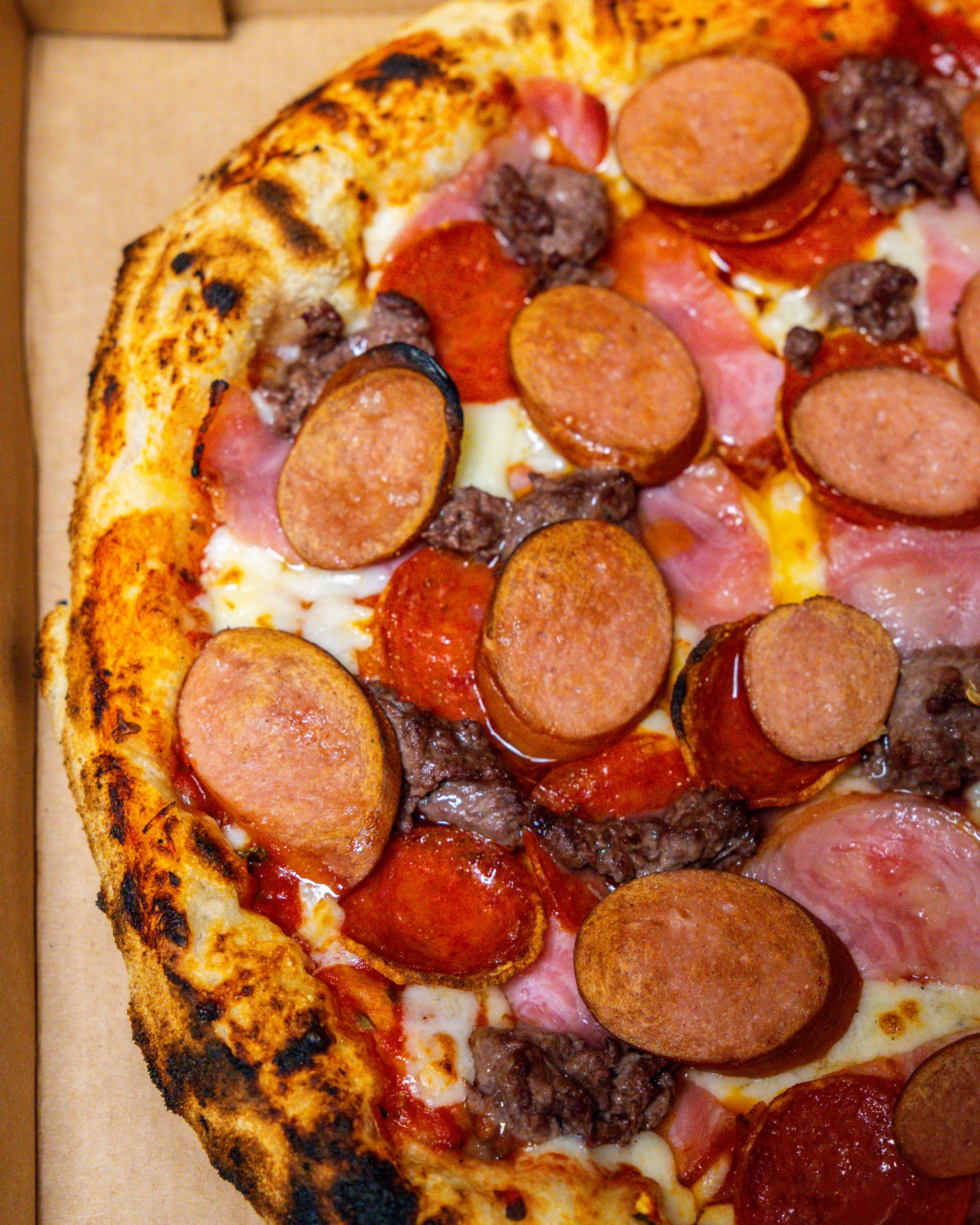 Tomate, mozzarella, carne de vaca, salchichas, bacon y pepperoni