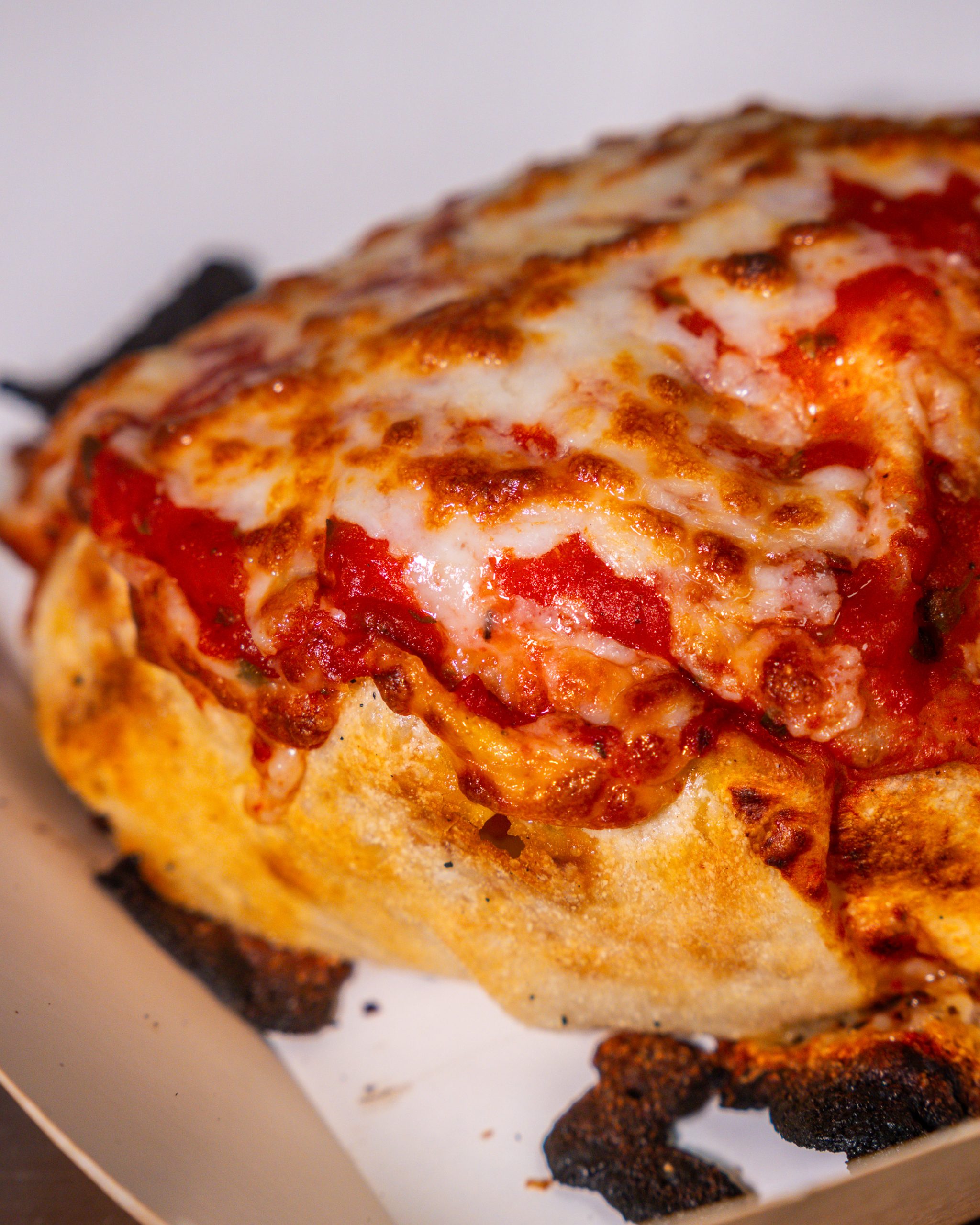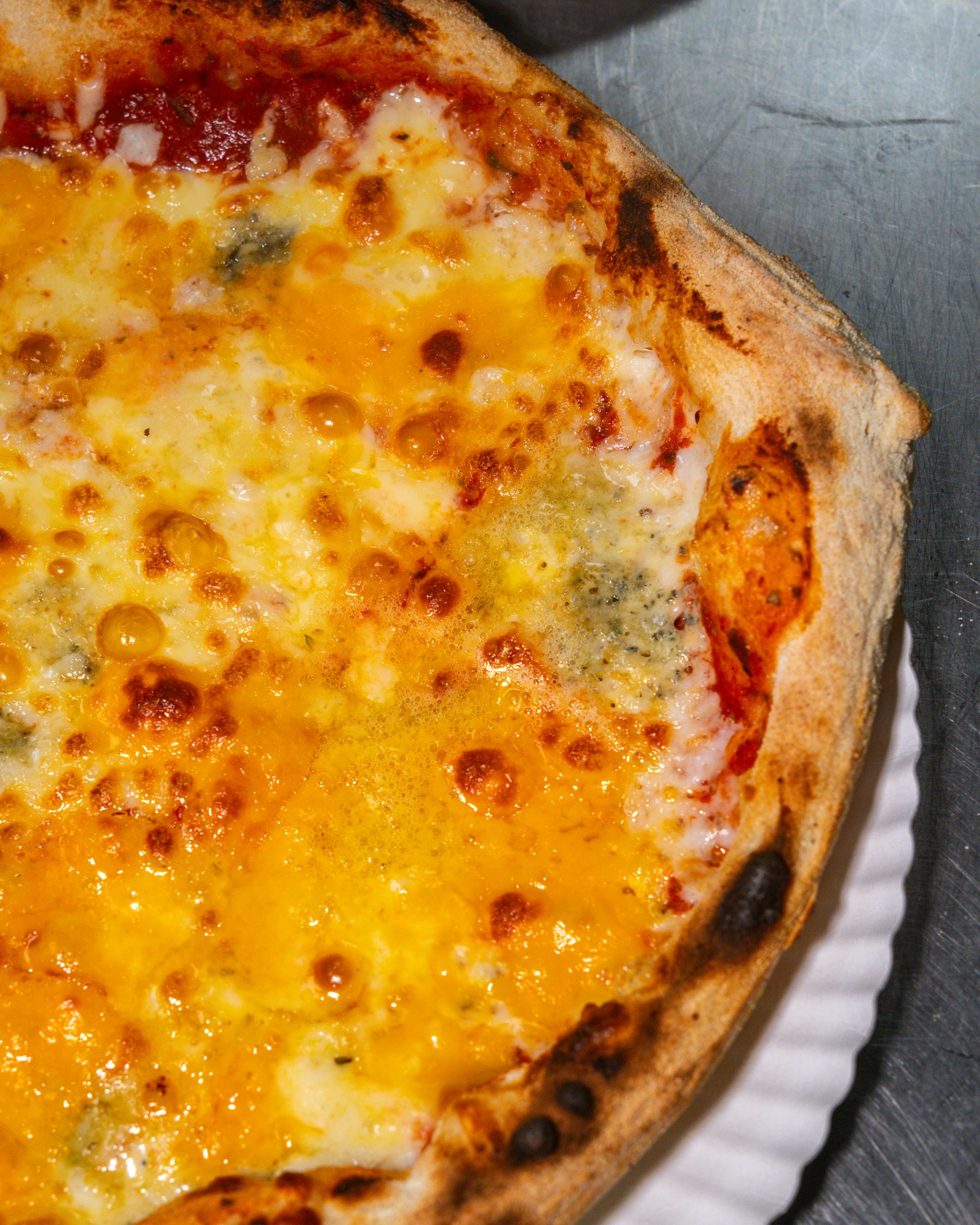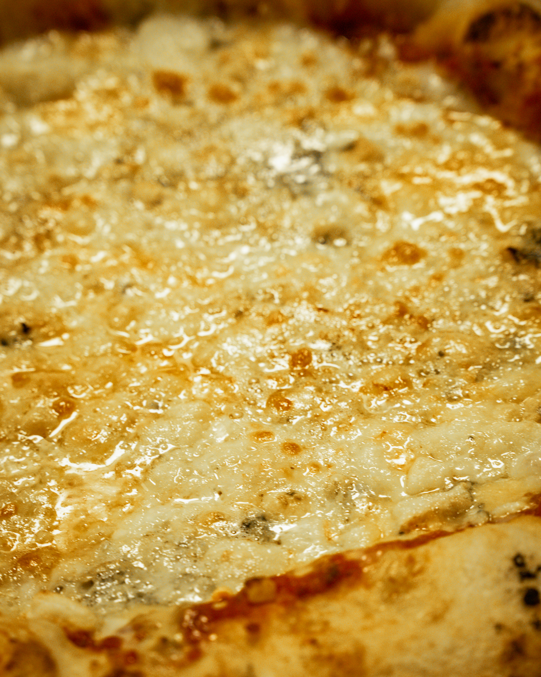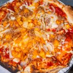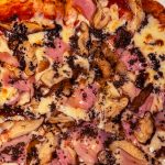 Tomate, mozzarella, carne de vaca, salchichas, bacon y pepperoni