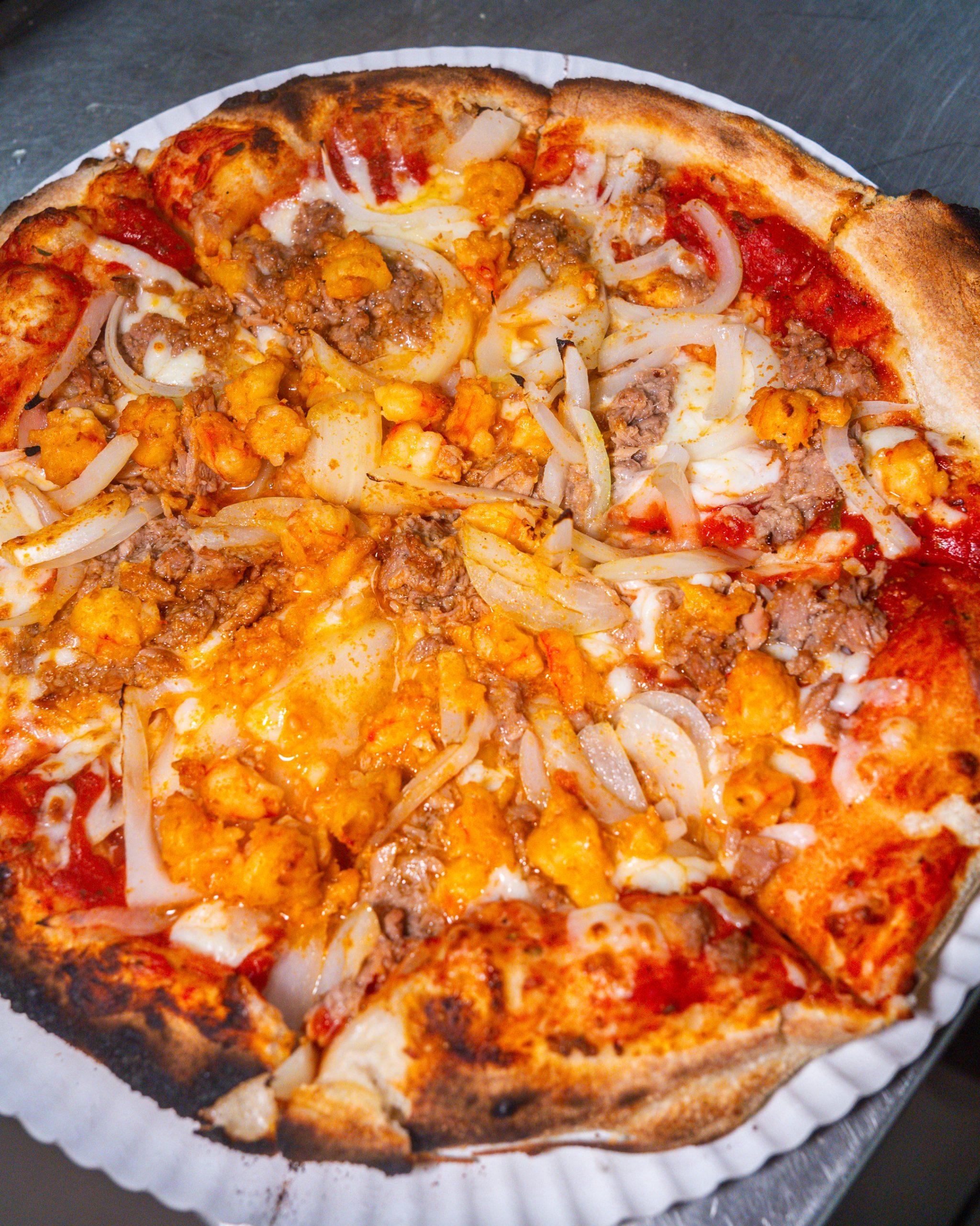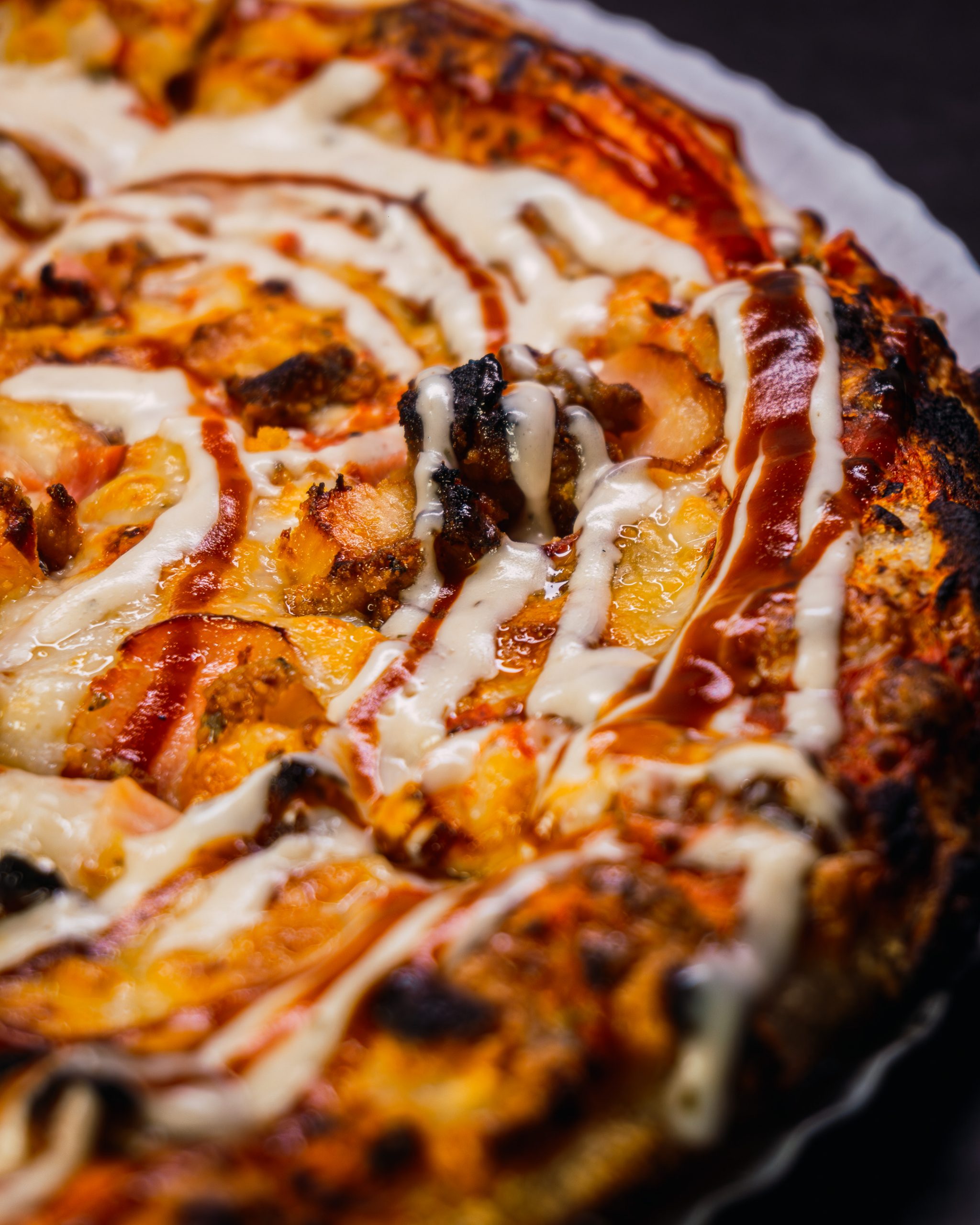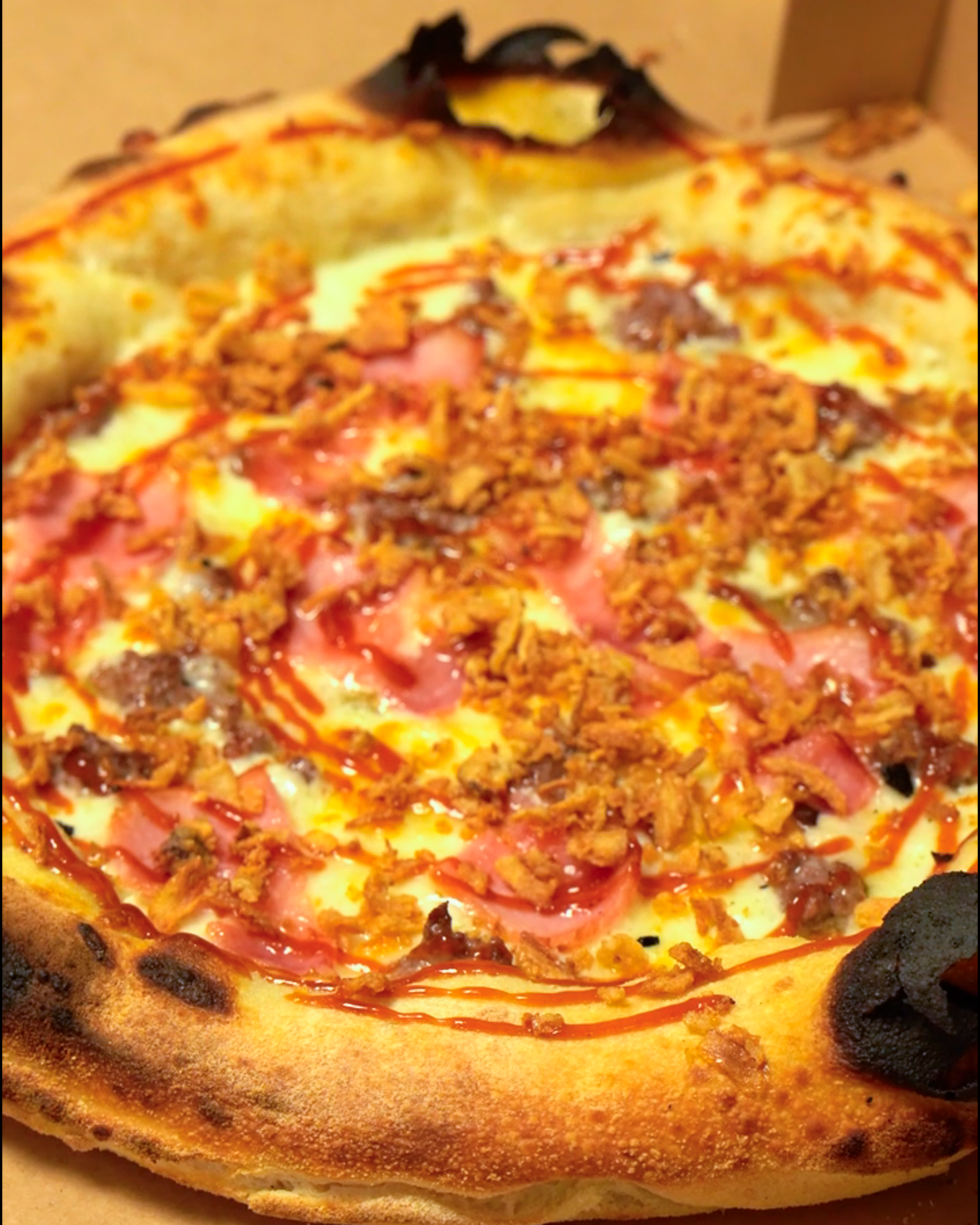 Tomate, mozzarella, carne de vaca, bacon, salsa barbacoa y cebolla frita