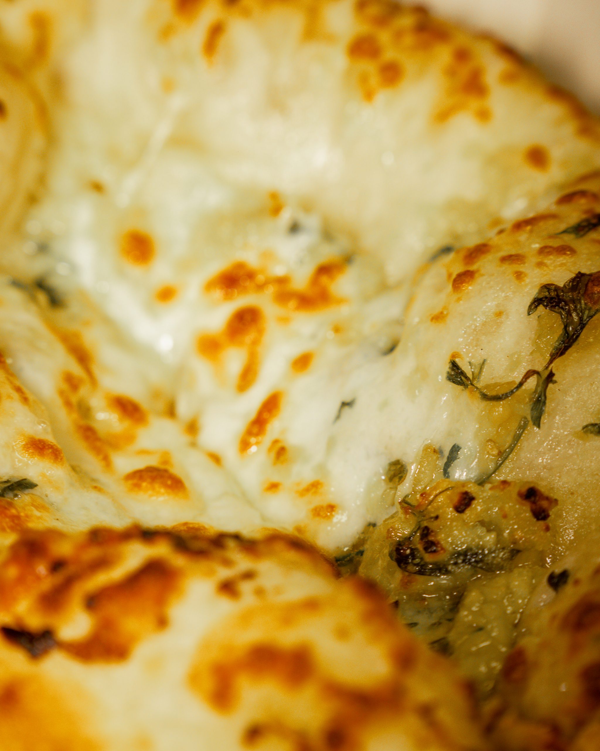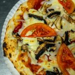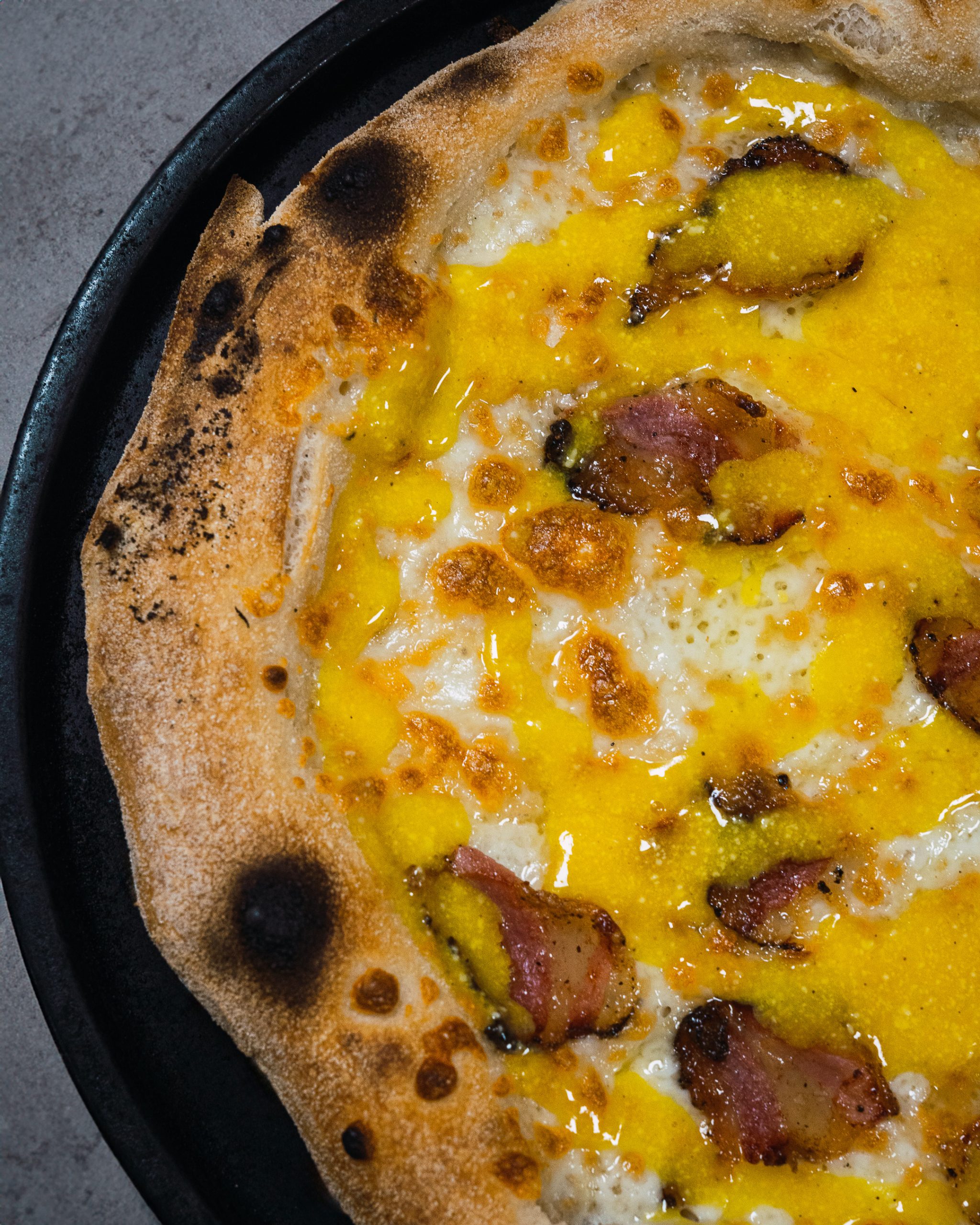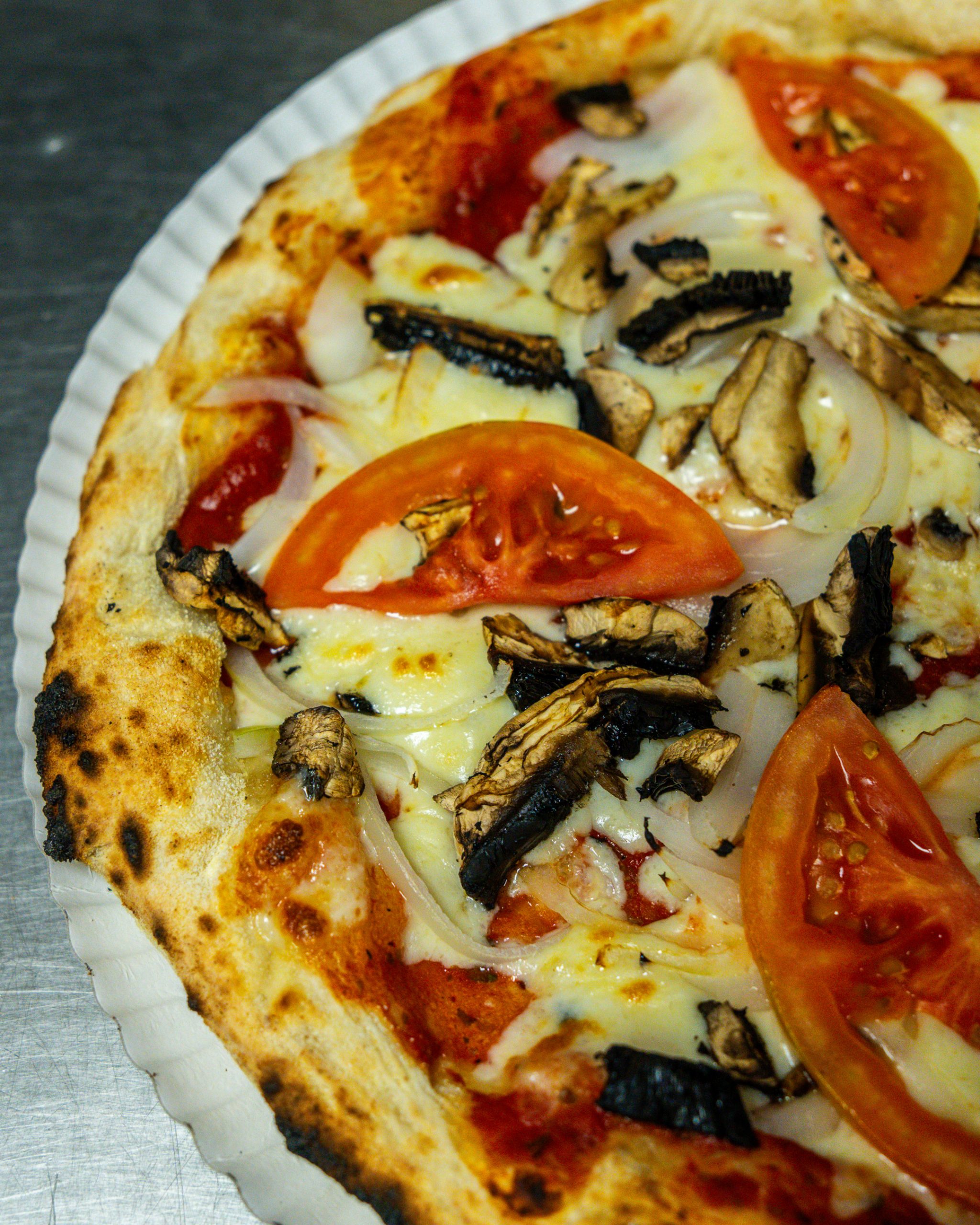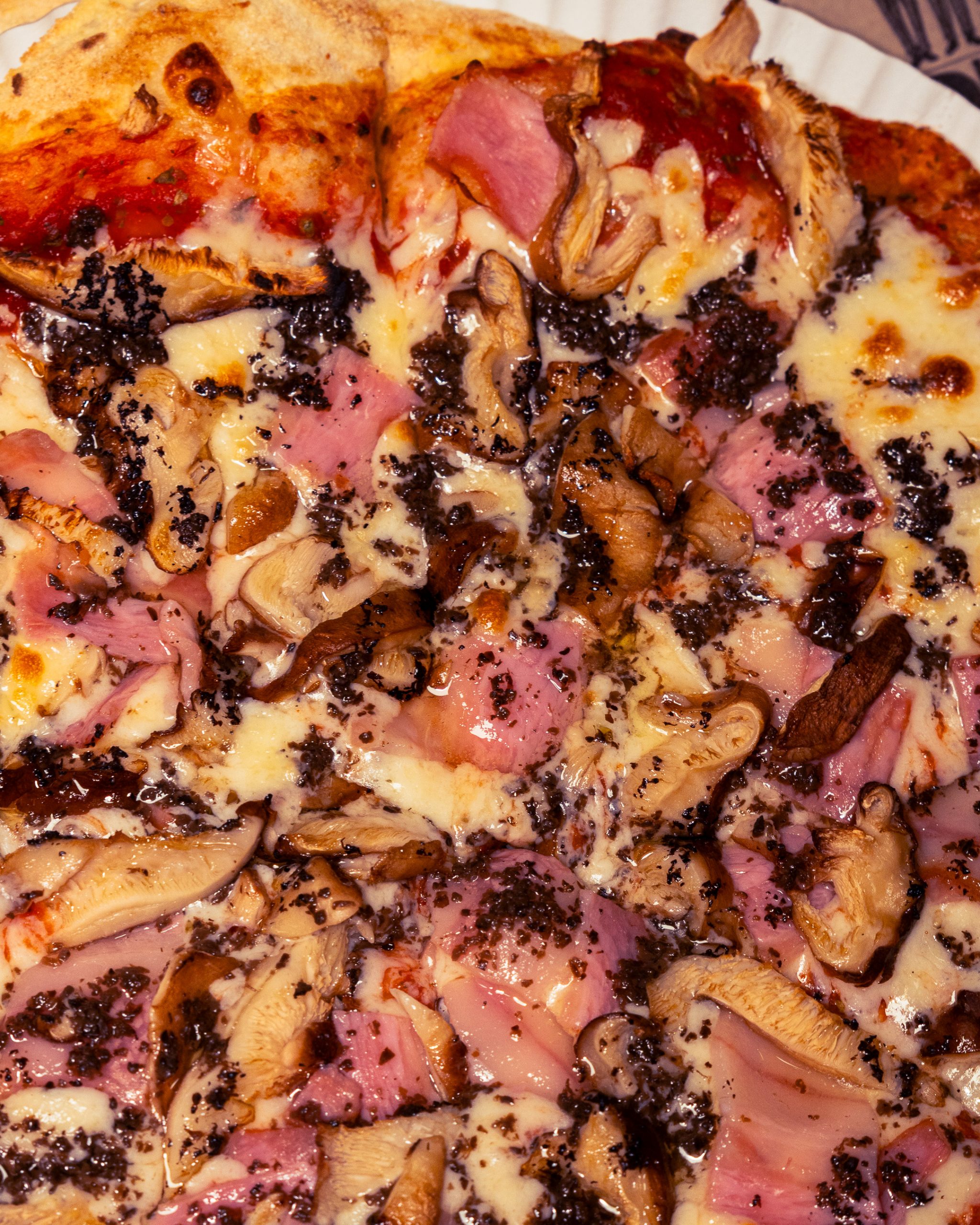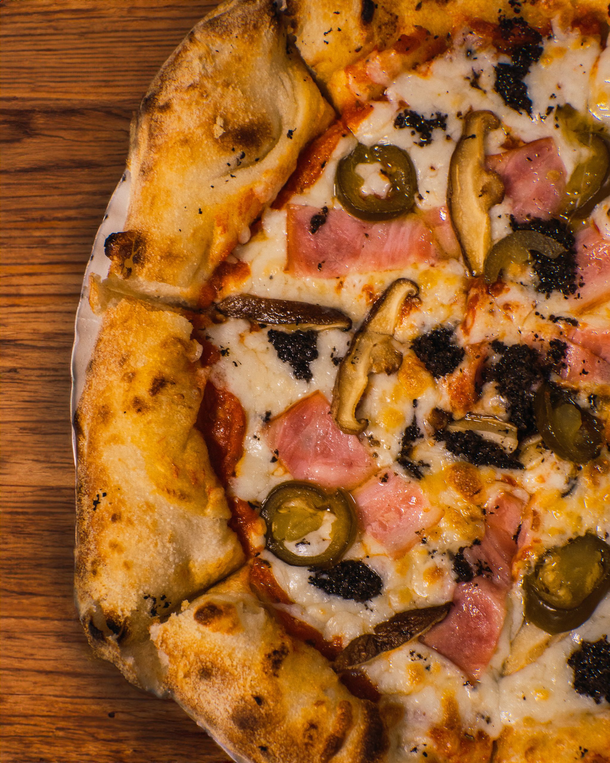 Tomate, mozzarella, crema trufa, bacon, setas shiitakes