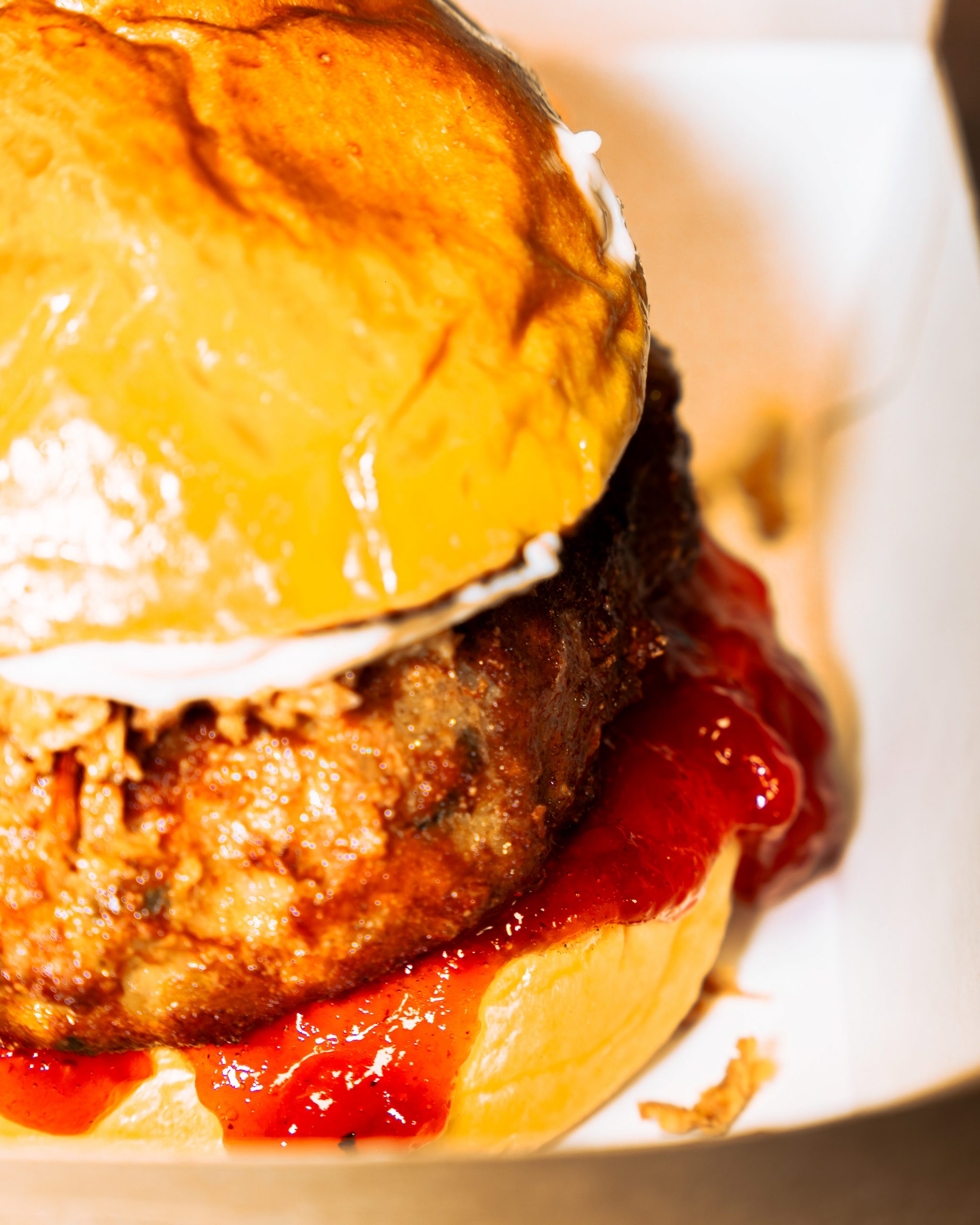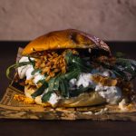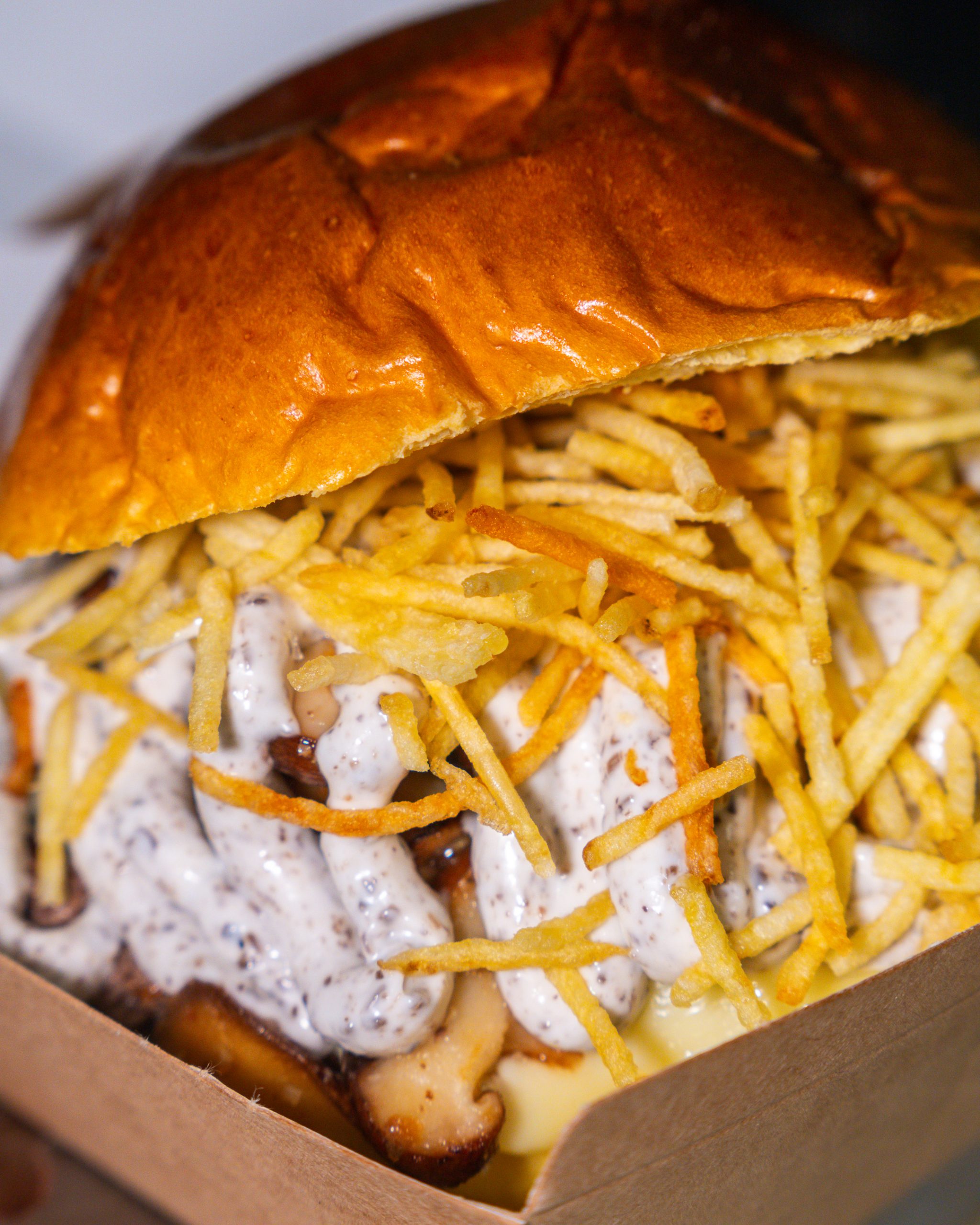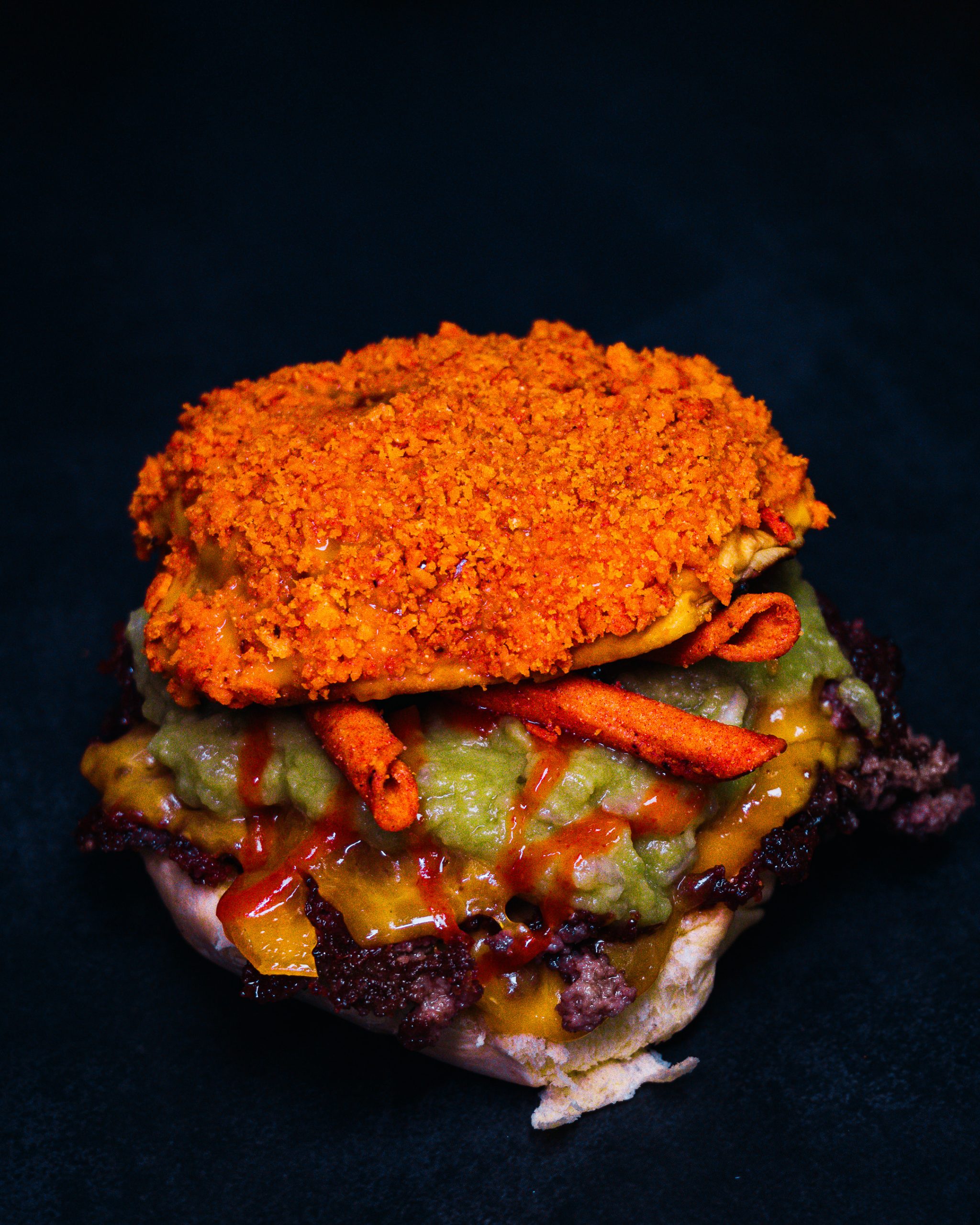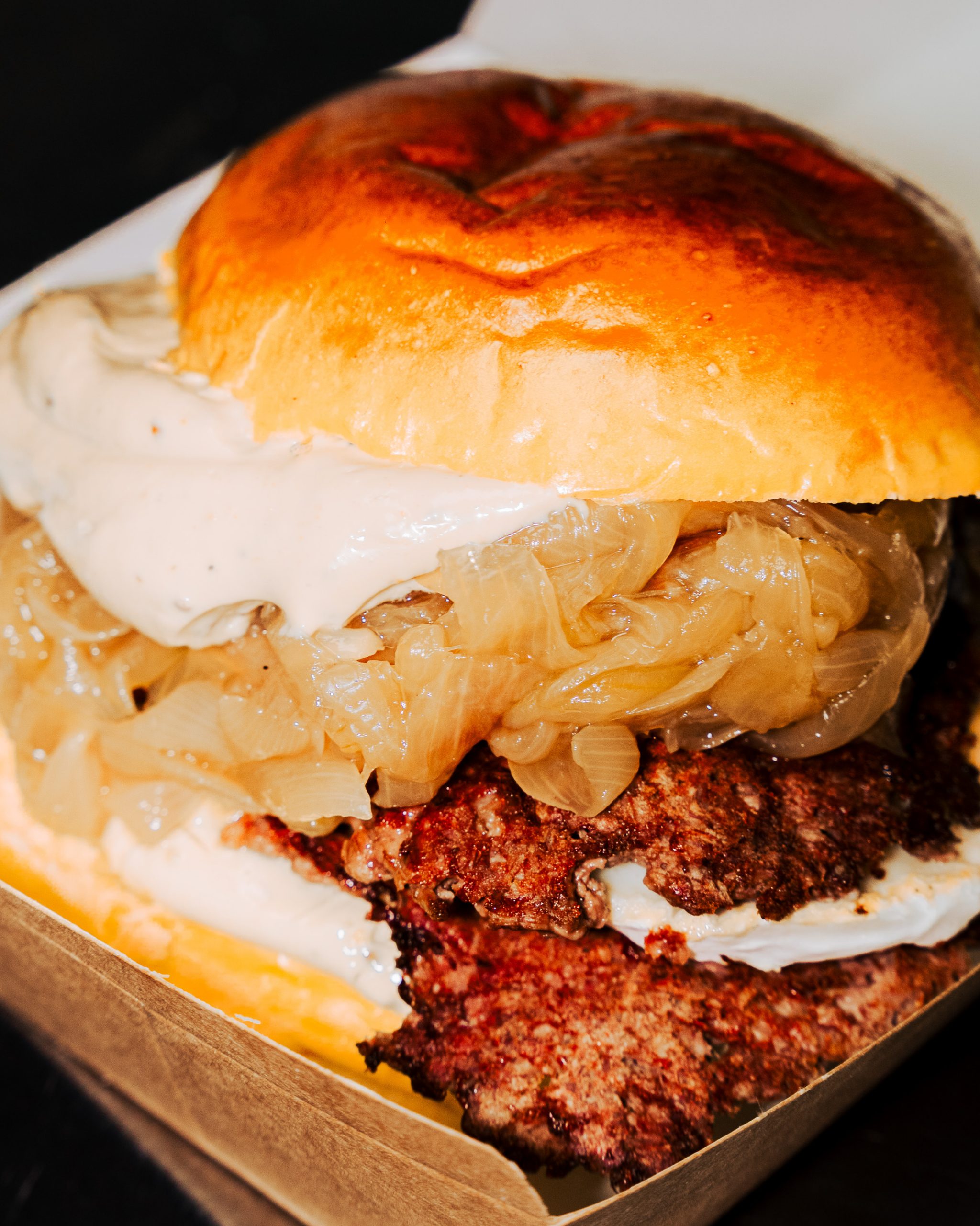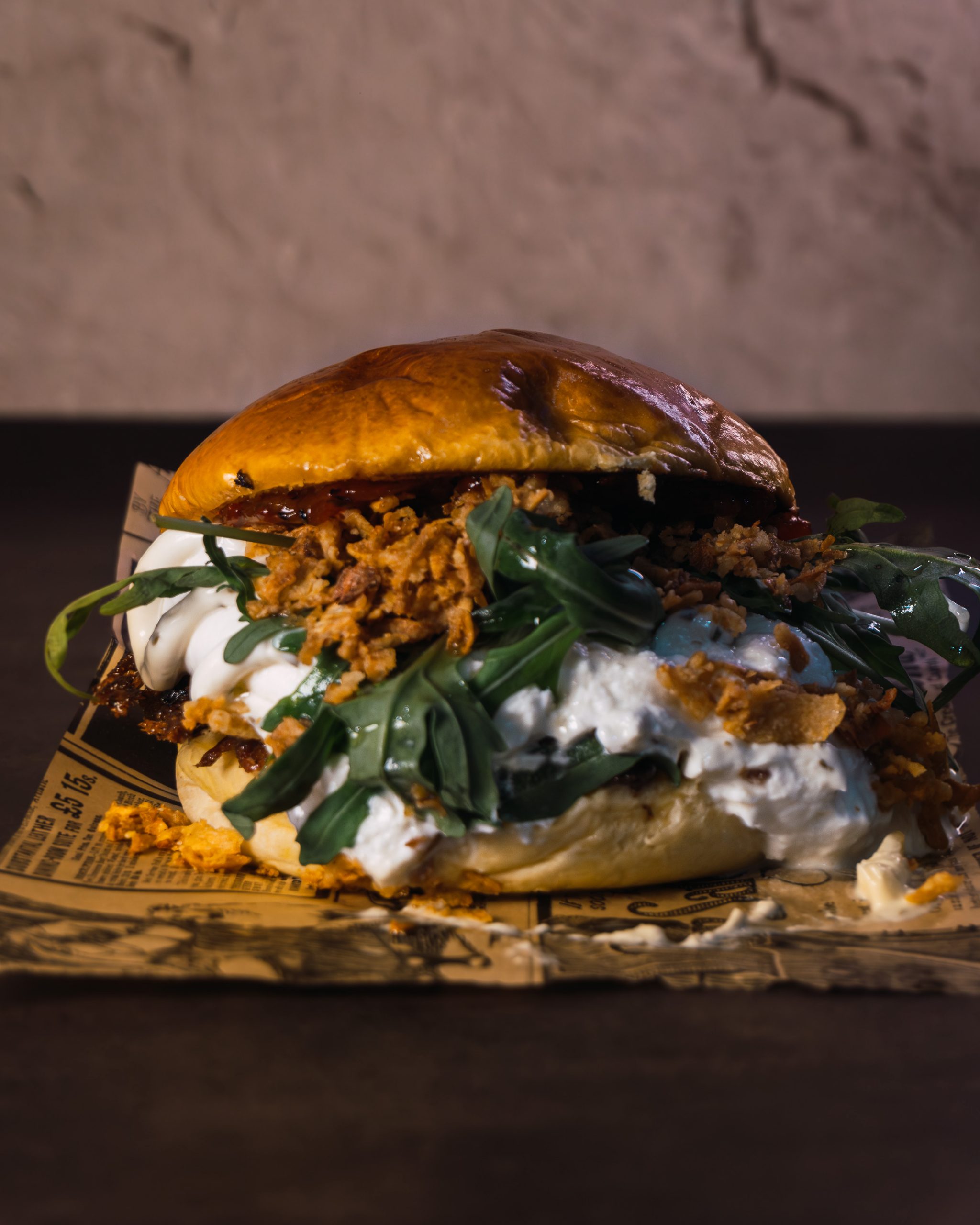 Brioche de patata, doble smash, burrata desilachada, rucula, cebolla crujiente, pimientos asados y caramelizados y mayonesa de pesto
