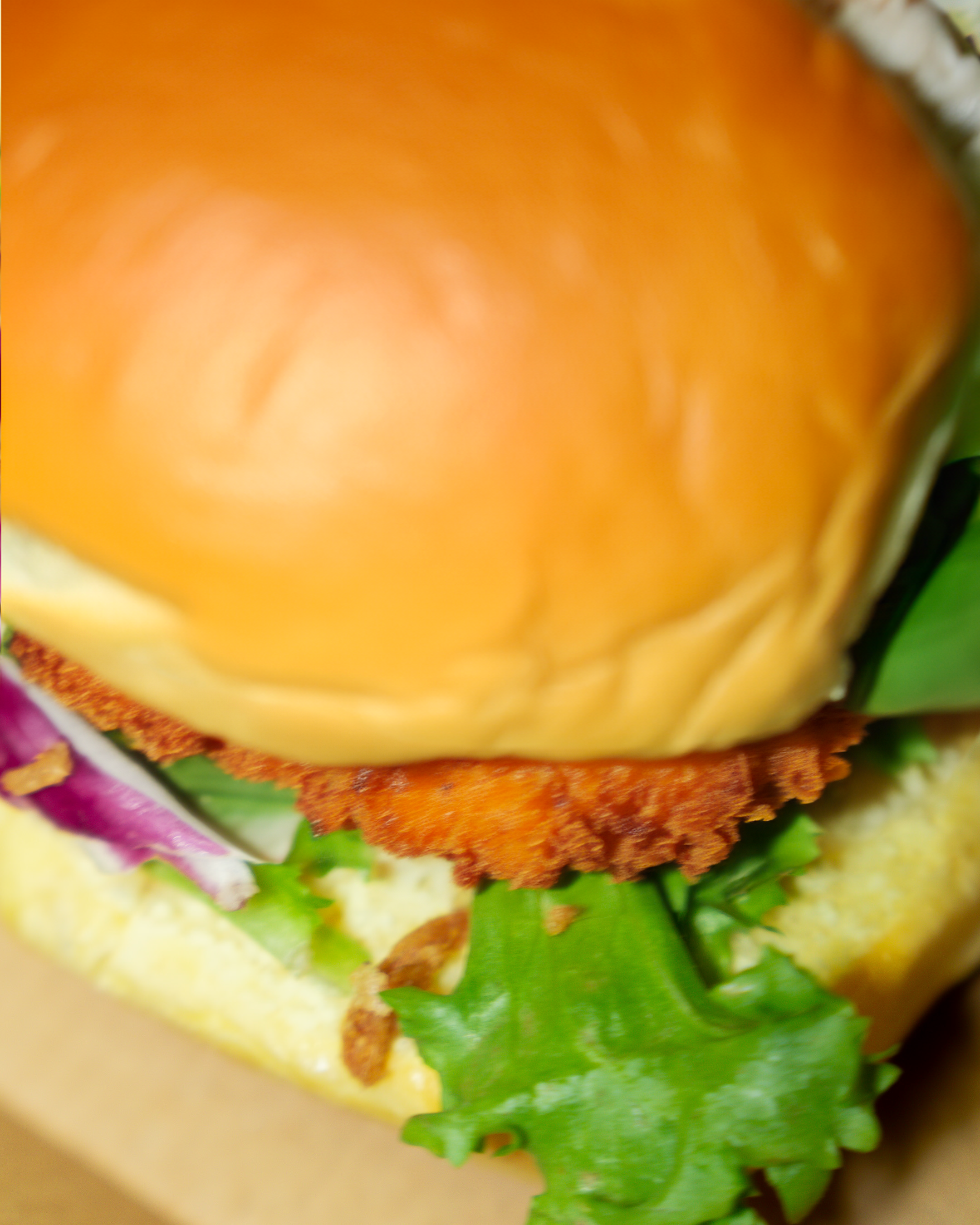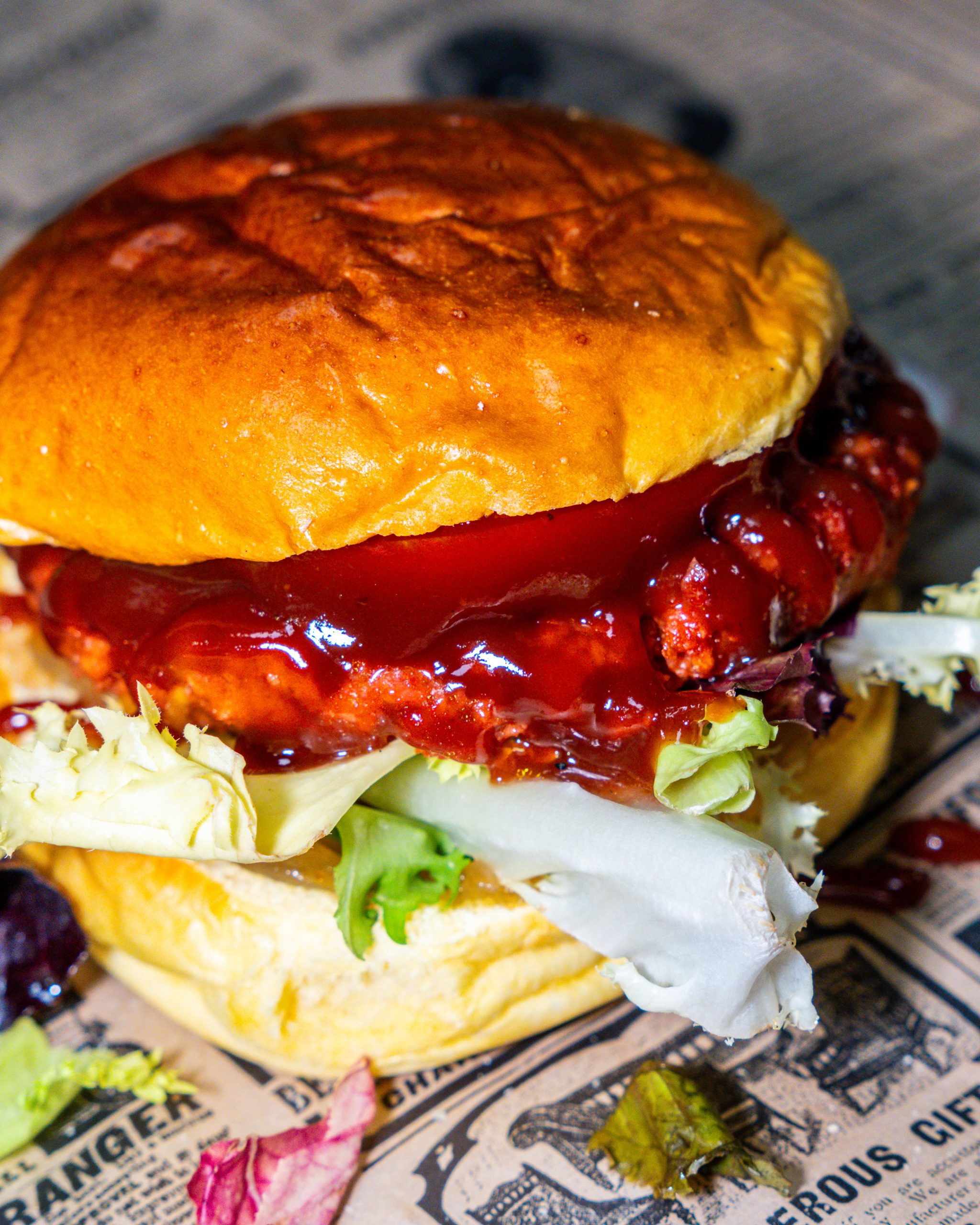 (Imposible que sea vegana). La acompañamos de mézclum, cebolla caramelizada y salsa barbacoa.