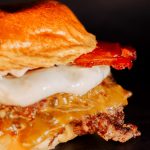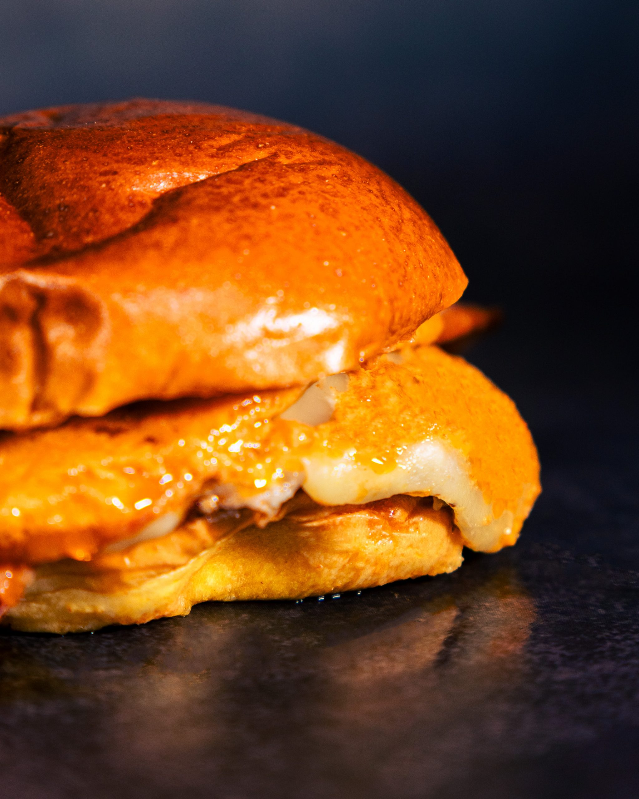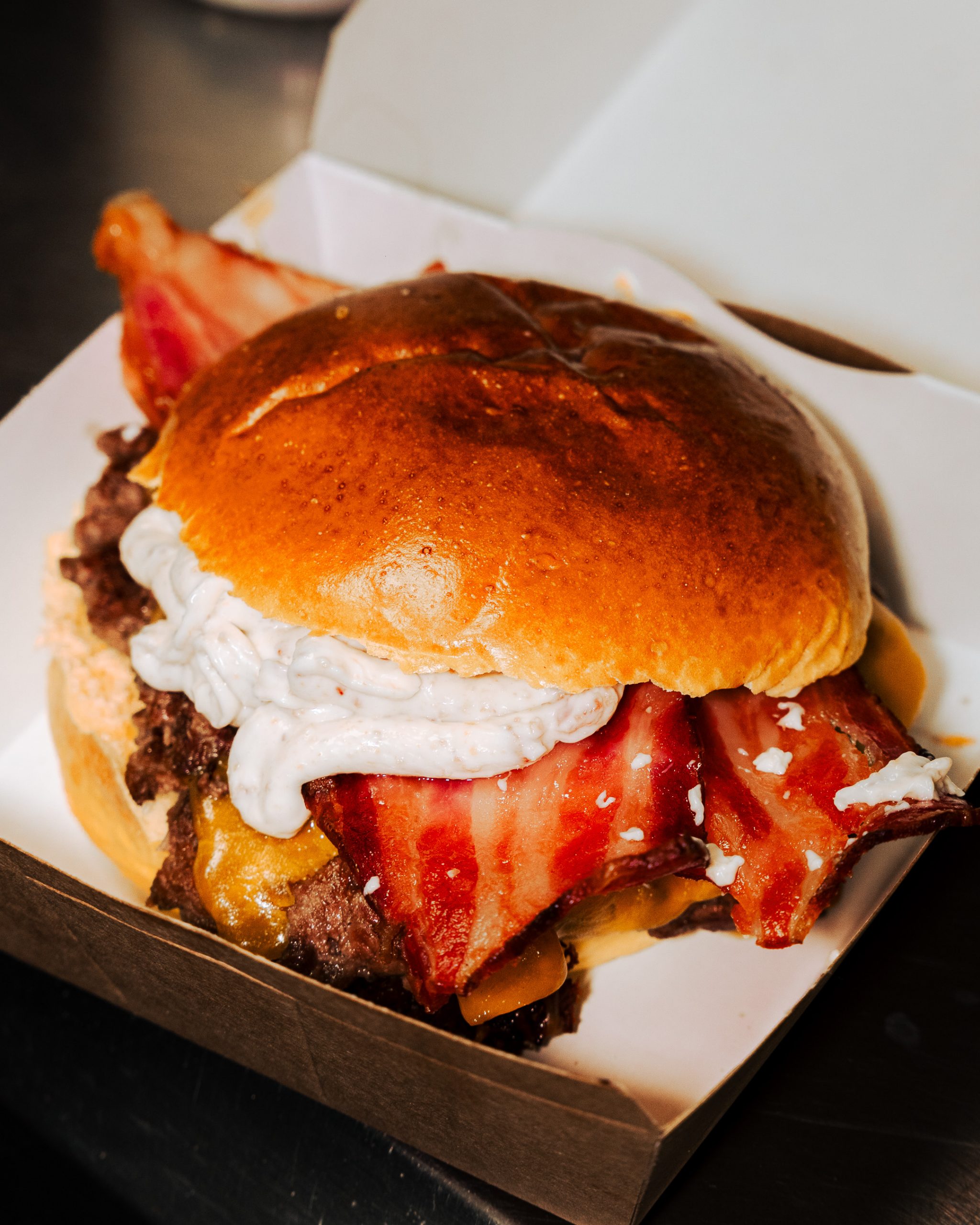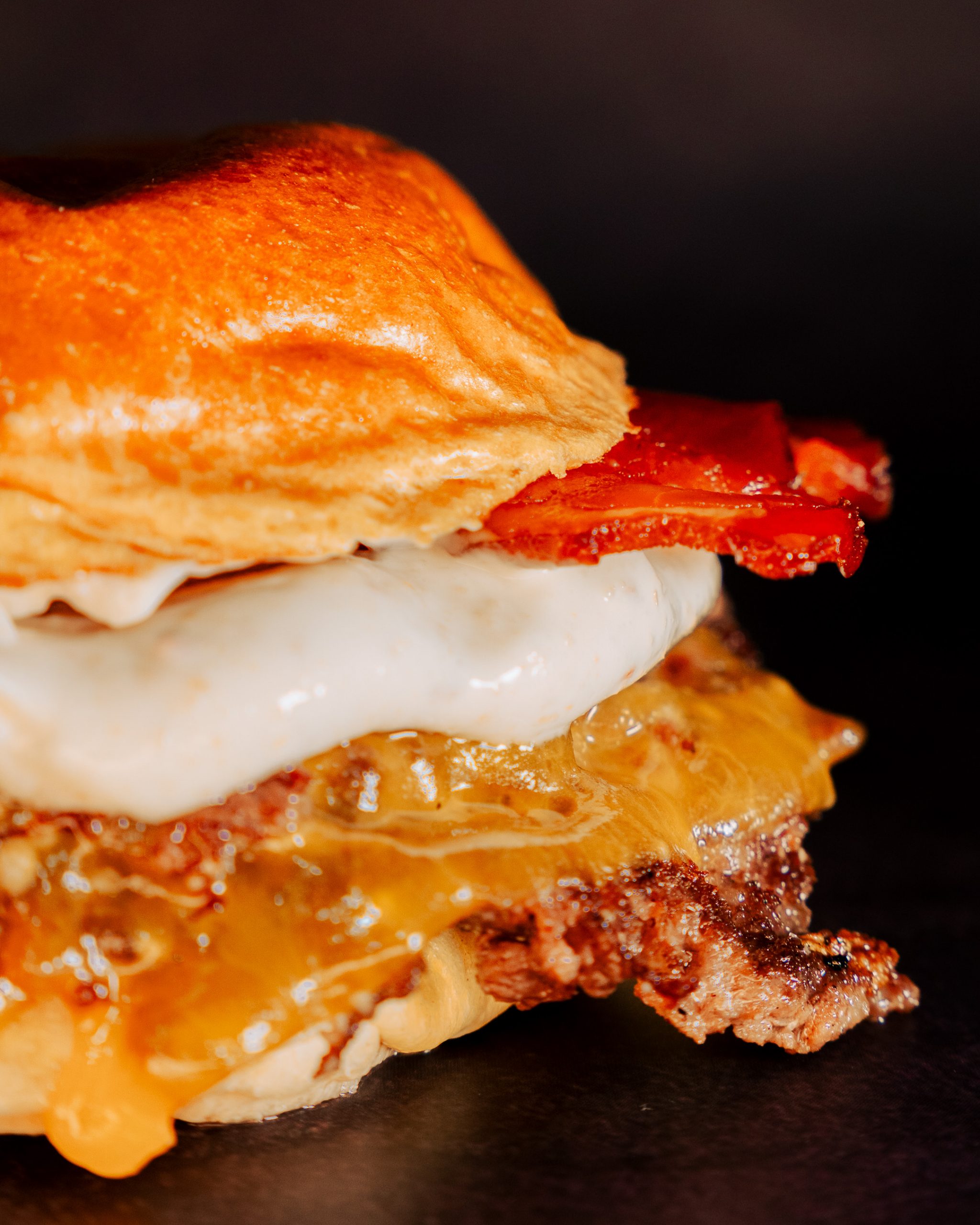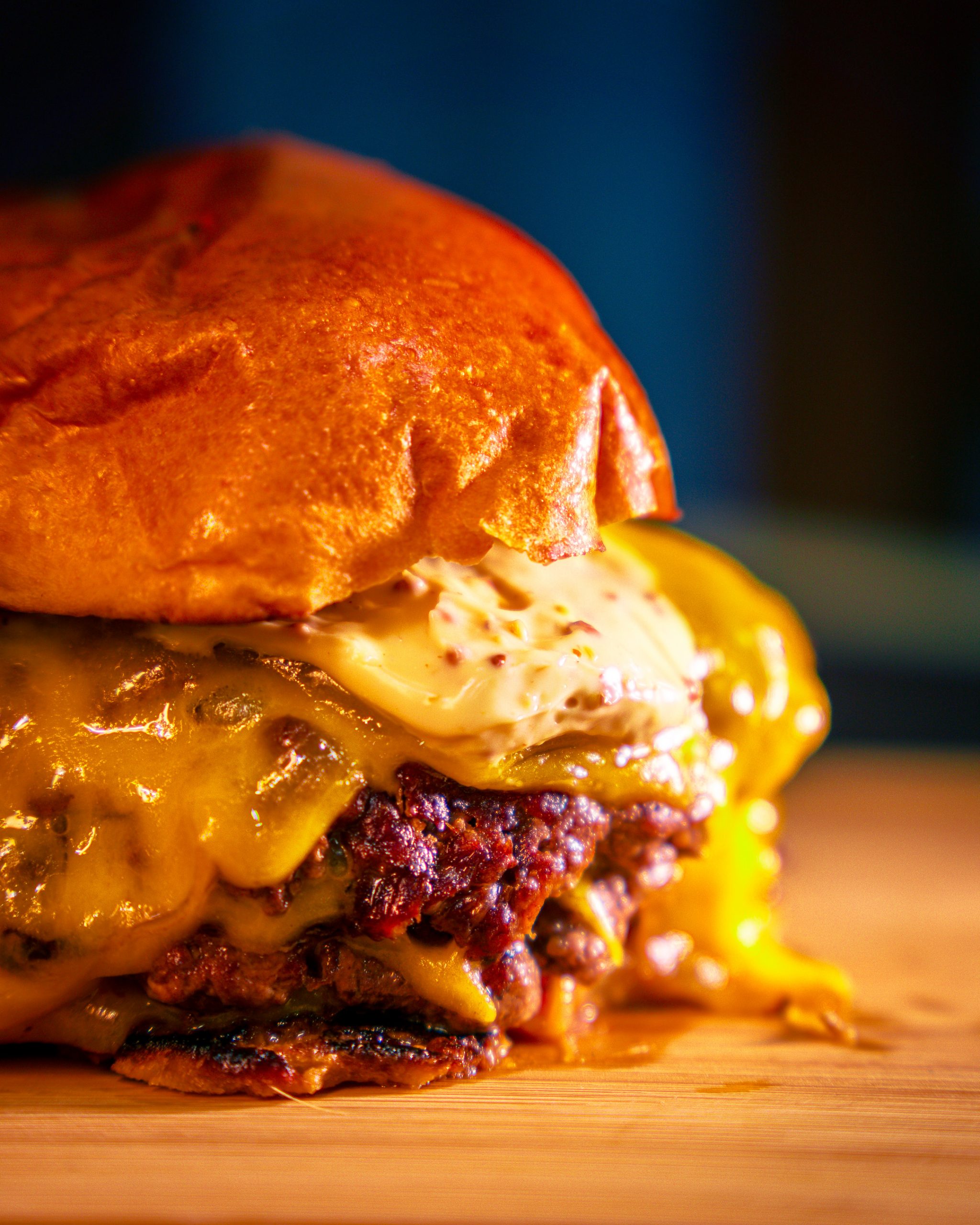 Presentada al concurso de burguer de Andalucia. Doble patty smash de Rubia Gallega, queso brie fundido, mayonesa ahumada de bacon y manzana caramelizada al Ron.