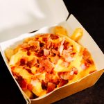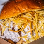 100% carne de VACUNO, queso de cabra, cebolla caramelizada y salsa “miel y mostaza”, acompañada con patatas fritas.