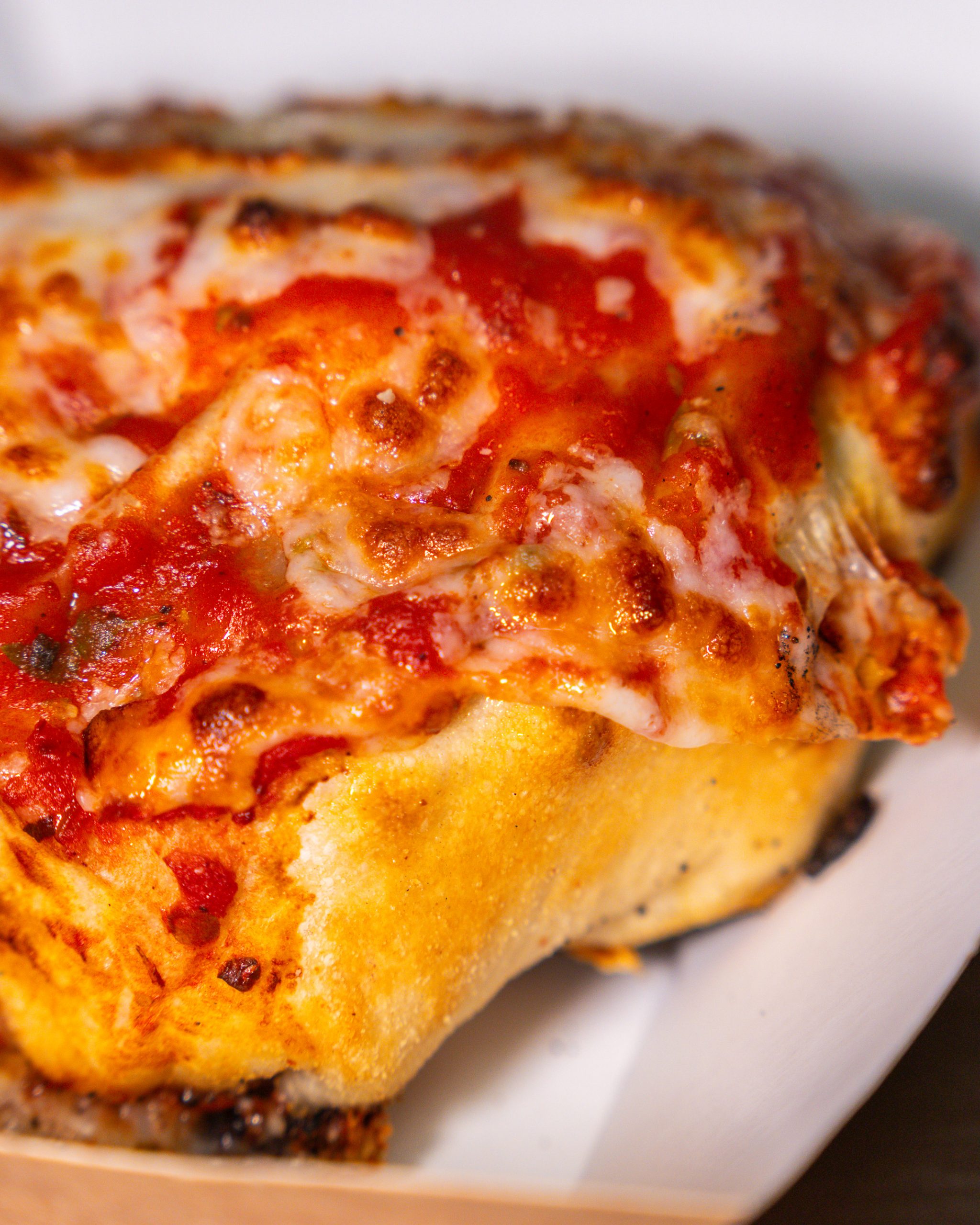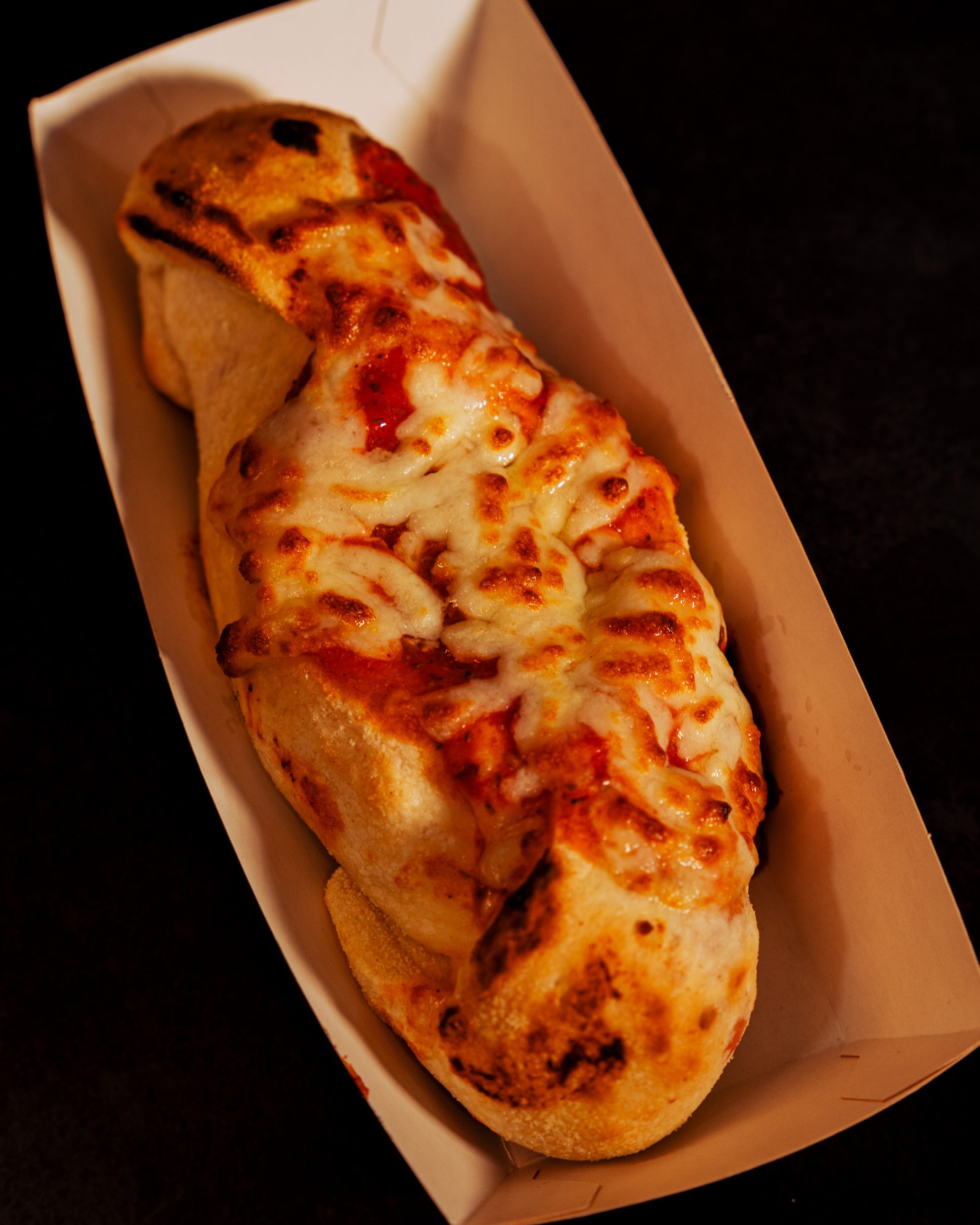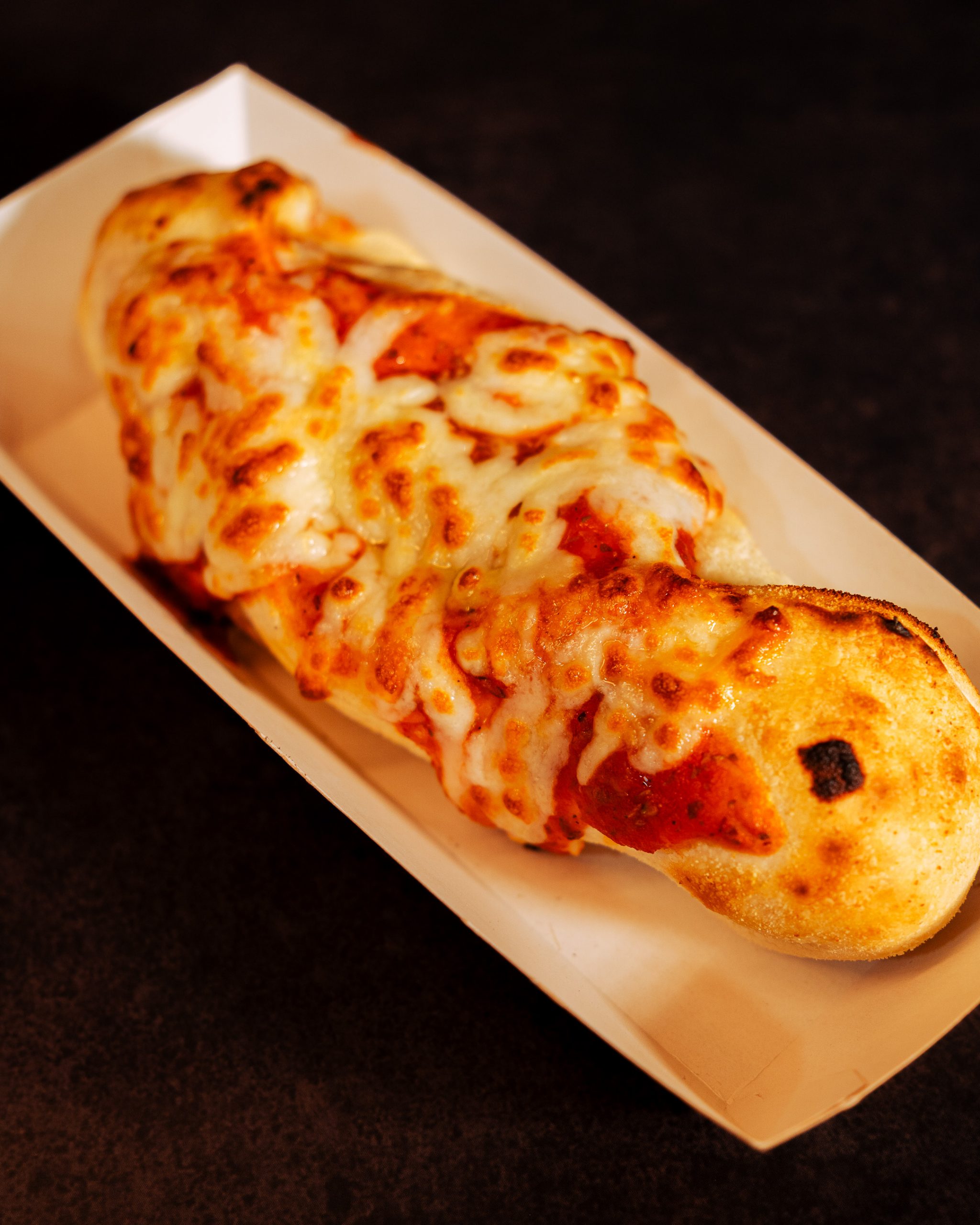 Salchicha BOCKWURST con queso y bacon envuelto en masa de pizza, PUEDES AÑADIRLE TOPPINGS DE PIZZA!!