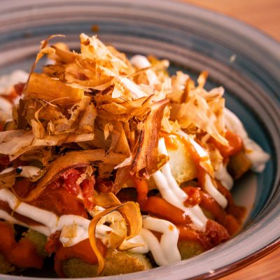 Price: 7€ Menu: soltando amarras Author: vapu Papas super crunchy, salsa brava casera, alioli, mojama de isla rayada y katsuobushi
