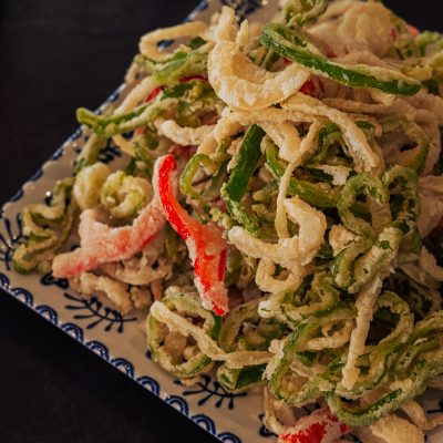 Price: 7€ Menu: A compartir... o no, Vegano Author: vapu Selección de rodajas de pimiento y cebolla en una fritura crujiente.
