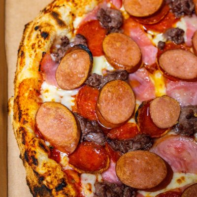 Price: 12,90 Menu: Pizzas Author: vapu Tomate, mozzarella, carne de vaca, salchichas, bacon y pepperoni