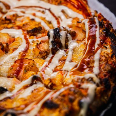 Price: 12,9 Menu: Pizzas Author: vapu Tomate, mozzarella, bacon, pollo frito Kentucky, Salsa BBQ, salsa yogurt
