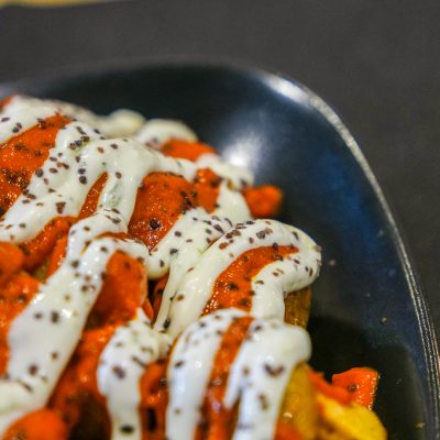 Patatas baby hechas al horno, con final crujiente en freidora y nuestra salsa brava casera de chipotles y alioli de huevo frito