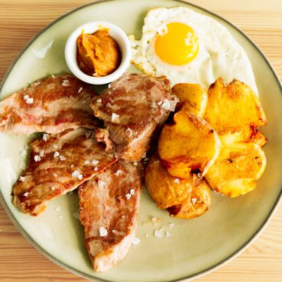 Price: 21€ Menu: Carnes, Niños, polizones Author: vapu Con huevo frito, guarnición de patatas fritas y mojo picón (aparte).